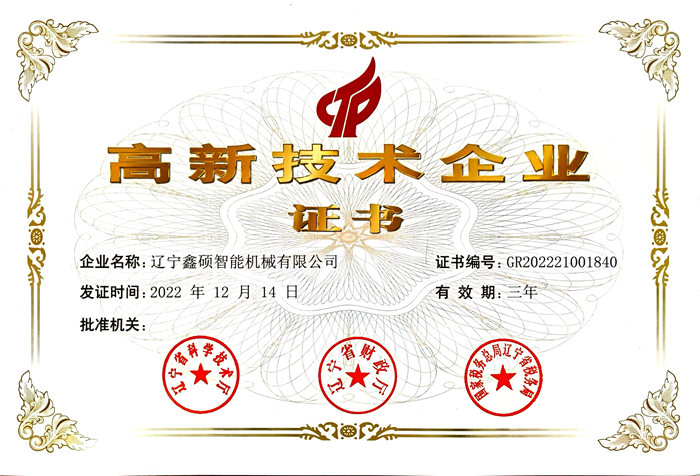 根據(jù)《高新技術(shù)企業(yè)認(rèn)定管理辦法》(國(guó)科發(fā)火〔2016〕32號(hào))和《高新技術(shù)企業(yè)認(rèn)定管理工作指引》(國(guó)科發(fā)火〔2016〕195號(hào))有關(guān)規(guī)定,憑借雄厚的研發(fā)隊(duì)伍、專業(yè)的技術(shù)實(shí)力、持續(xù)的創(chuàng)新能力及科學(xué)的企業(yè)管理,經(jīng)過(guò)各部門嚴(yán)格的測(cè)評(píng)和層層審批,遼寧鑫碩智能機(jī)械有限公司正式被認(rèn)定為國(guó)家級(jí)高新技術(shù)企業(yè)。